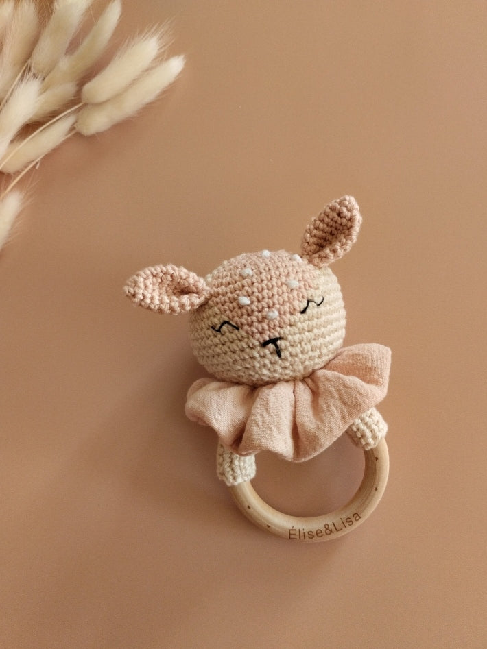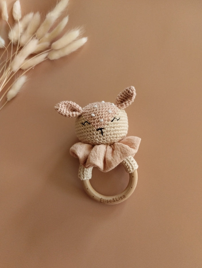 Hochet biche réaliser au crochet et sa collerette en couture sur un anneau en bois naturel ( non traité)