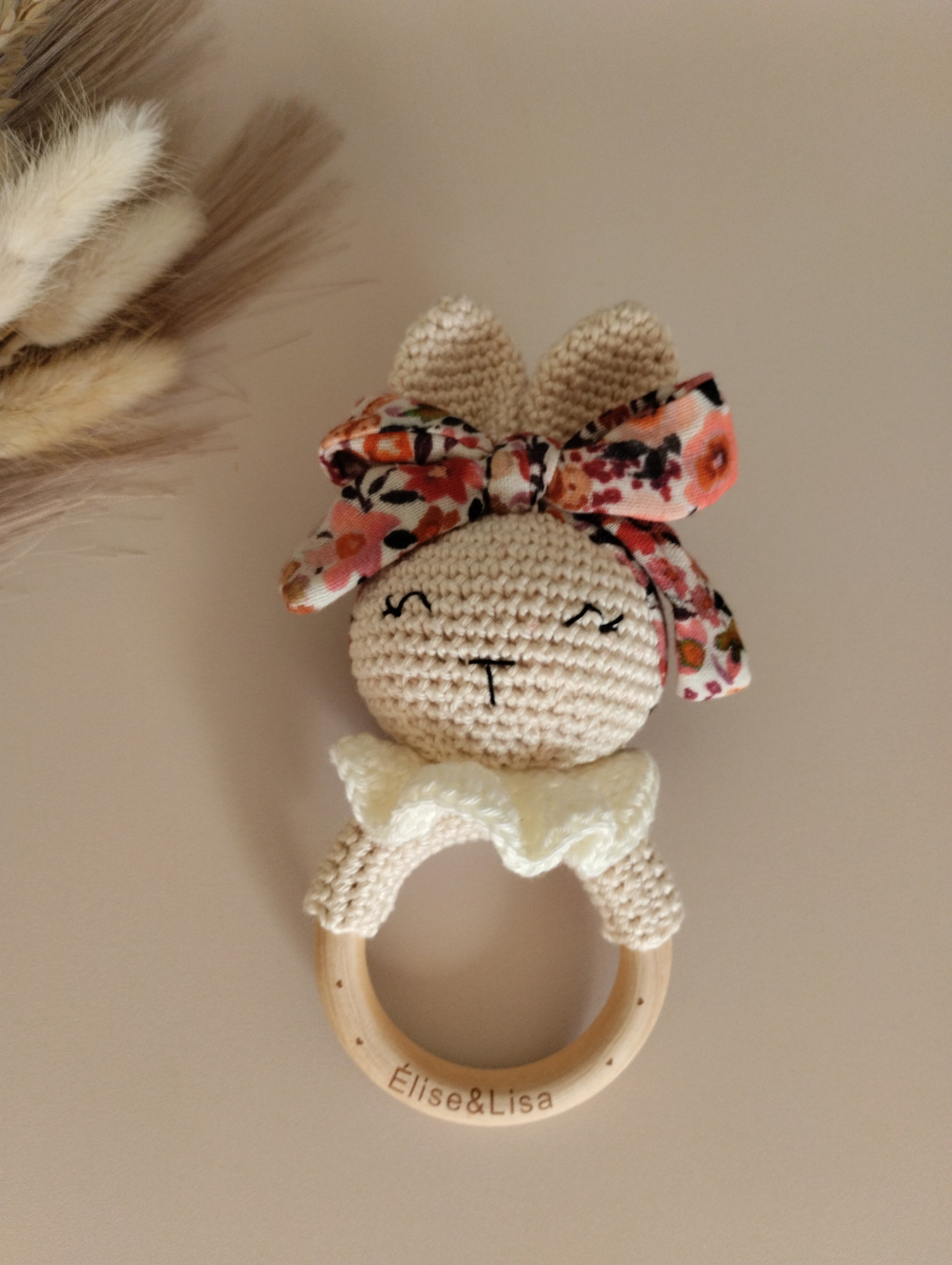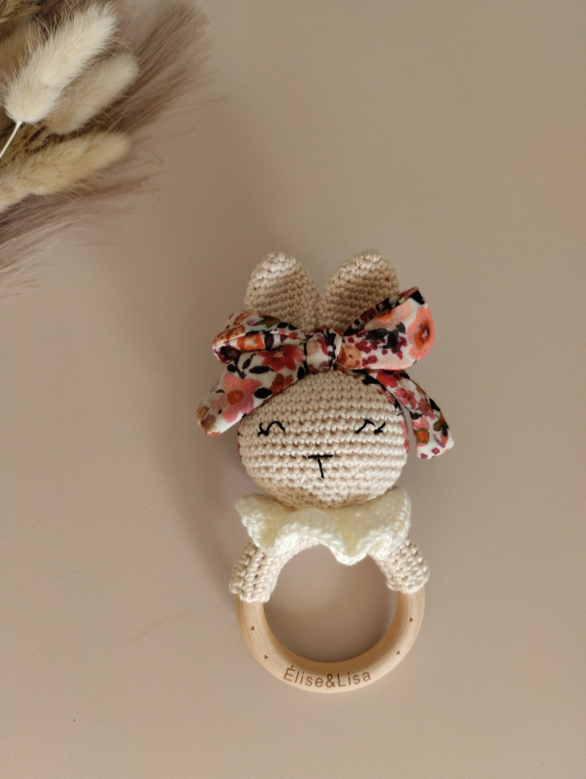 Hochet lapinette réaliser au crochet et sa collerette en crochet sur un anneau en bois naturel ( non traité)