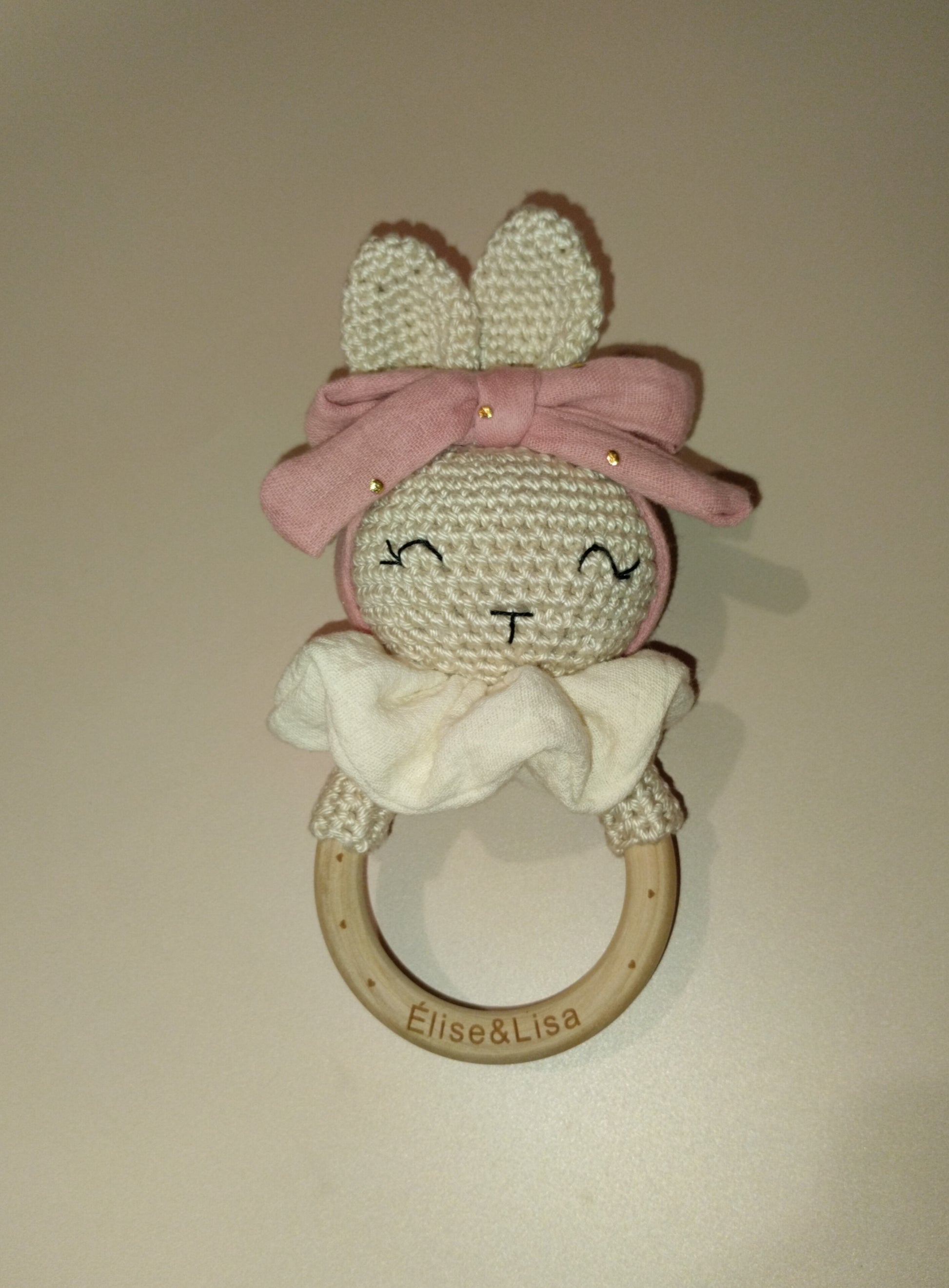 Hochet lapinette réaliser au crochet et sa collerette en couture sur un anneau en bois naturel ( non traité)