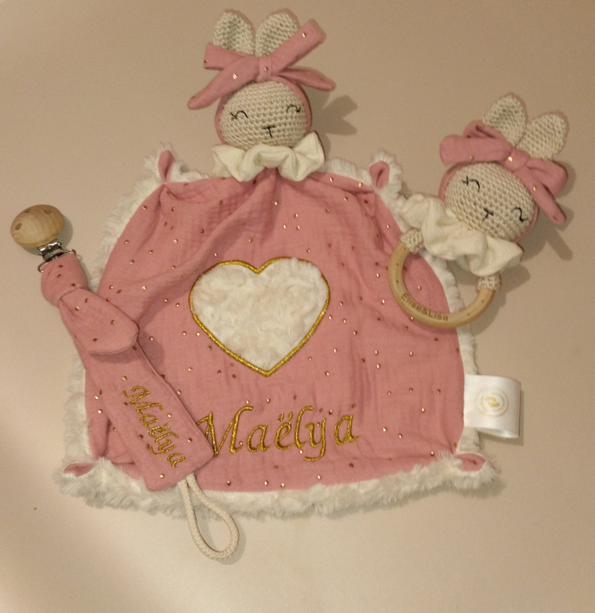 hochet lapinette vieux rose et doré